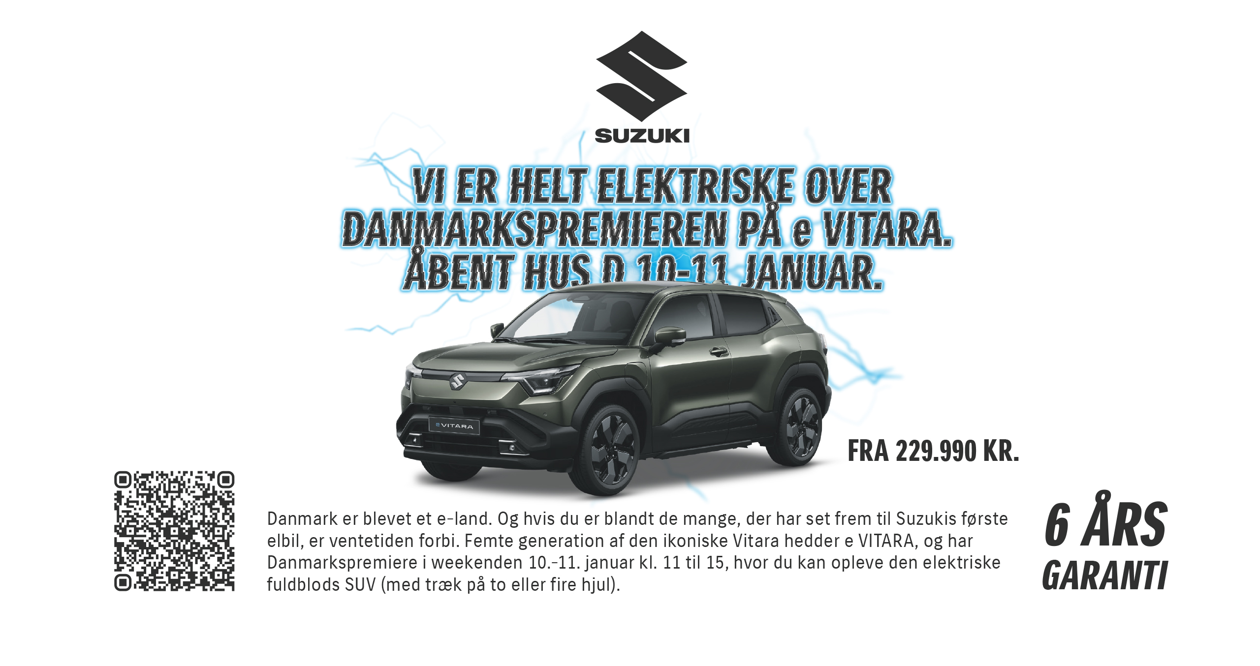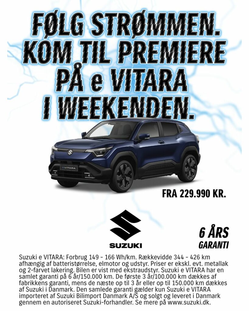 Så er vi klar til Danmarkspremieren på vores helt nye og 100% elektriske Suzuki e VITARA. Det foregår i weekenden den 10.- 11. januar kl. 11-15. Kig forbi, få lidt godt til ganen og oplev en helt elektrisk Vitara på nærmeste hold.